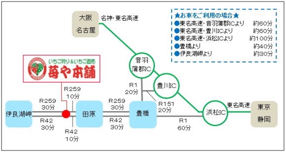 <東名高速 音羽蒲郡ICまたは豊川ICより約60分>