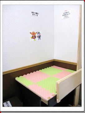 | トイレ | 水洗トイレ完備(おむつ替え台2台、車椅子対応用、男女別) (車椅子対応用トイレ) (おむつ替え台) ●男性用は、小用2、洋式個室1 ●車椅子対応用は、洋式個室(手すり付き)1、子供用おむつ替え台1 ●女性用は、洋式個室2、子供用おむつ替え台1 |